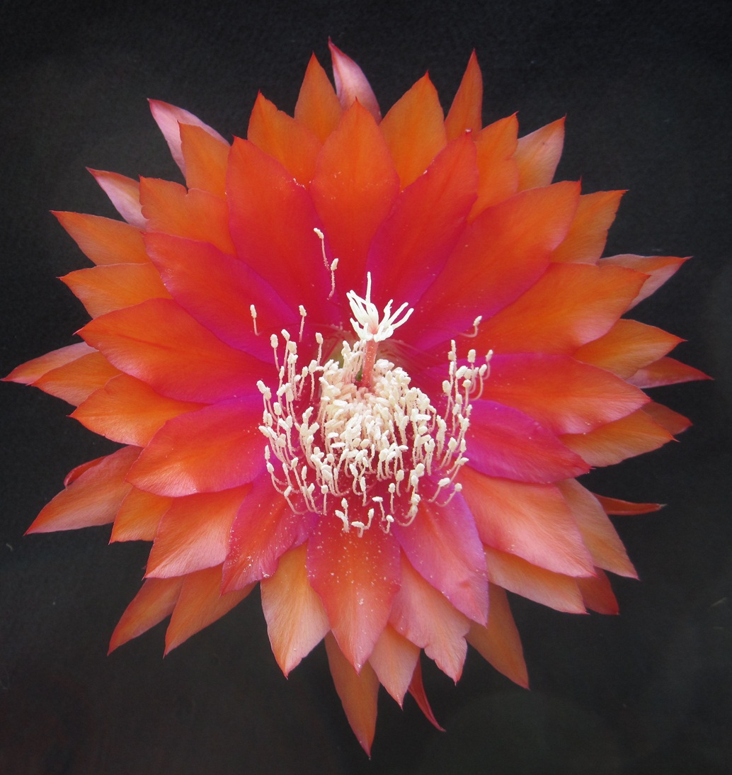 First row of inner petals red with an orange midstripe. Next rows orange with a pink-purple throat. Outer petals dark purple red with a brownish orange midstripe. Double, wide form. Flat and 3-angled thick growth. {L}. ‘Elinor Victoria Latimer’ × ‘Elegans Lei’.